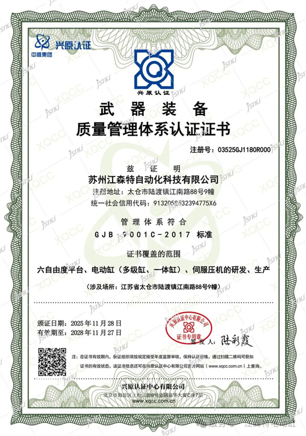After being audited by Xingyuan Certification (an authoritative certification body under China National Nuclear Corporation), the company has successfully passed the GJB9001C-2027 military quality system standard certification. The certification covers the research and development and production of six-degree-of-freedom platforms, electric cylinders (multi-stage cylinders/integrated cylinders), and servo presses.