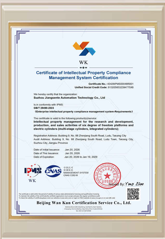Suzhou Johnson Automation Technology Co., Ltd. was established in 2014, integrating R&D, production, sales and service. Its products include: servo electric cylinders, heavy-duty cylinders, multi-stage cylinders, integrated cylinders, 6-degree-of-freedom platforms, 3-degree-of-freedom platforms, precision positioning slides, electric push rods, reducers, servo presses and other automation module products, as well as extended non-standard automation equipment, and it is constantly introducing new products.